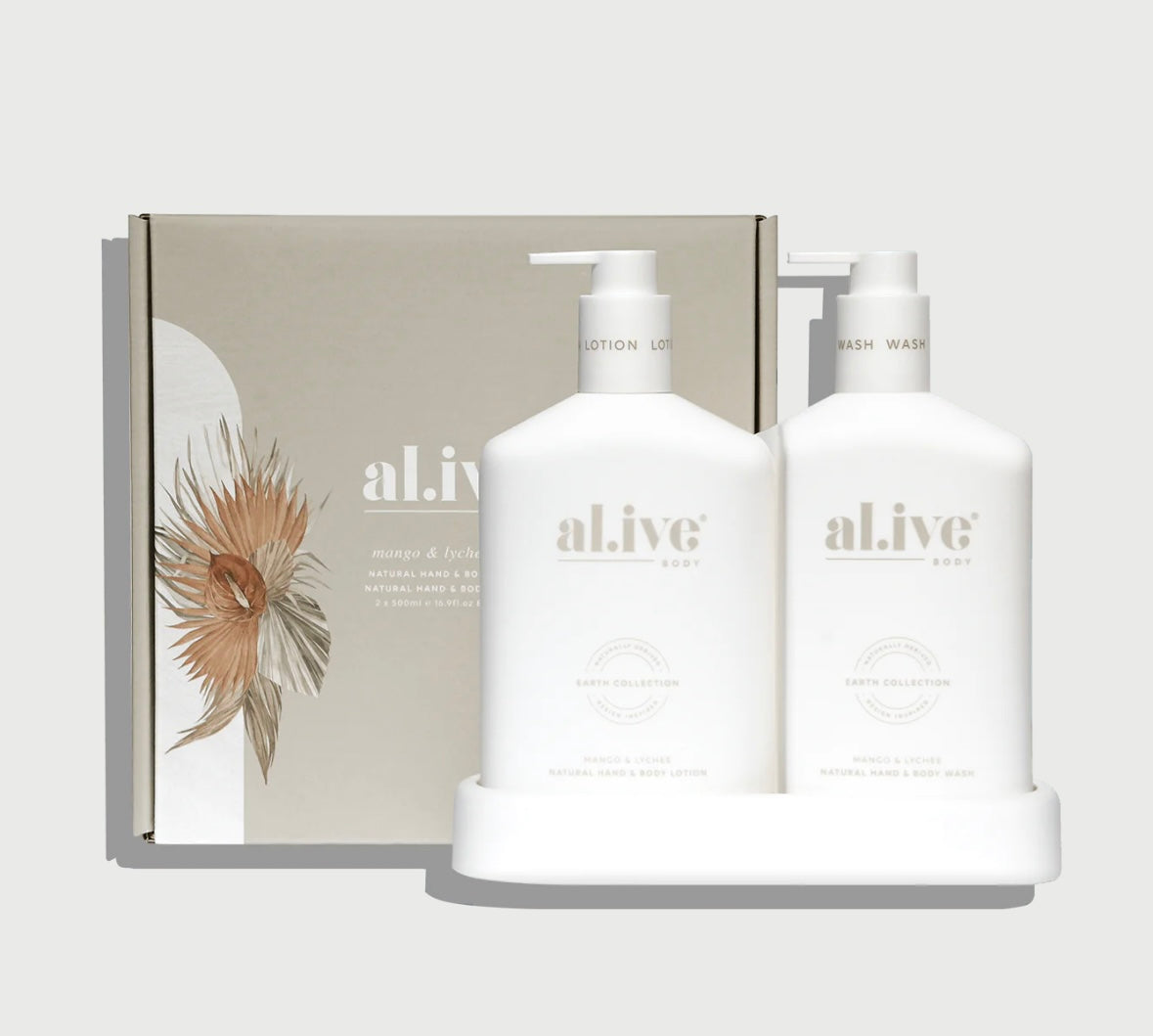 The al.ive body Mango & Lychee Hand & Body Wash/Lotion Duo contains a luxurious blend of naturally derived ingredients, fortified with essential oils and native botanical extracts.