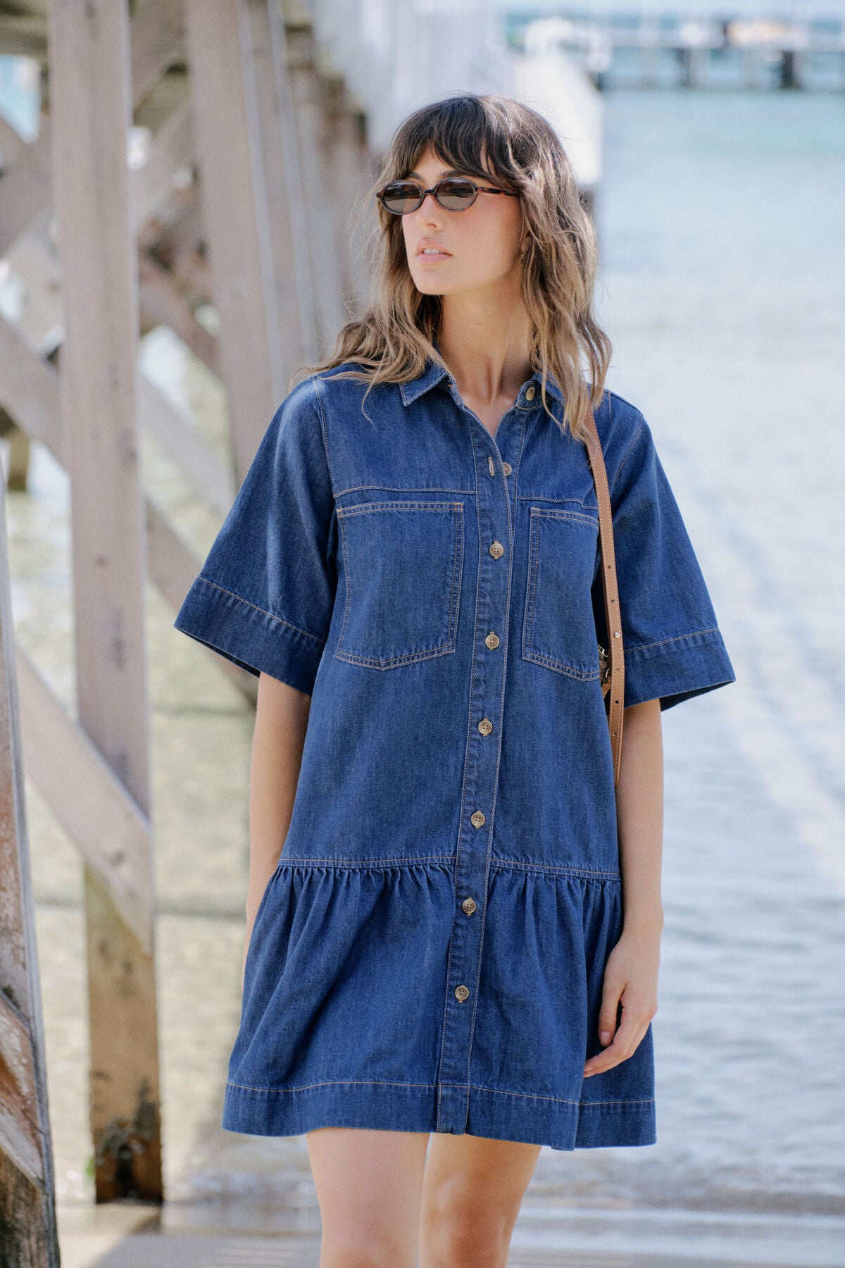 Ceres Life Short Sleeve Tiered Pocket Shirt Dress - midnight