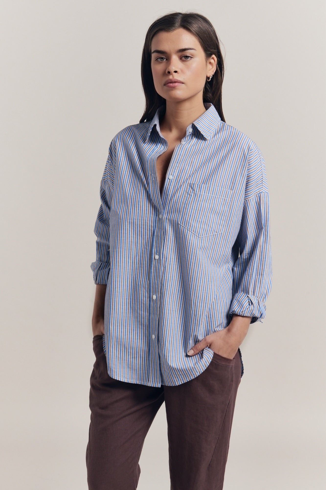 A subtle stripe shirt in crisp 100% cotton. An easy piece to wear on repeat especially back with our soft Otto Knits in blue and beige.