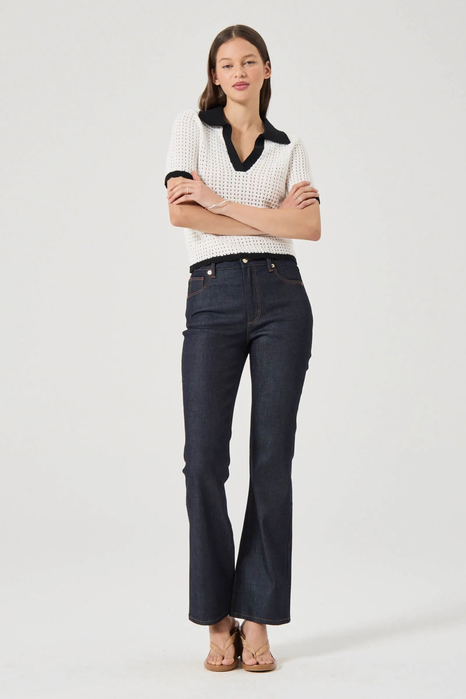 - Features a contrast collar and delicate scalloped edging at sleeve and hem