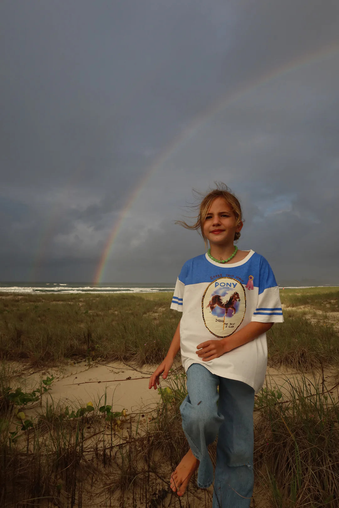 Crafted from super soft 100% cotton and washed for that vintage, lived-in feel, the Pony Club Tee features a hand-painted graphic front and centre. Enzyme washed to look like an old friend with charm. No two shirts are the same. Kids tee's are not oversized.