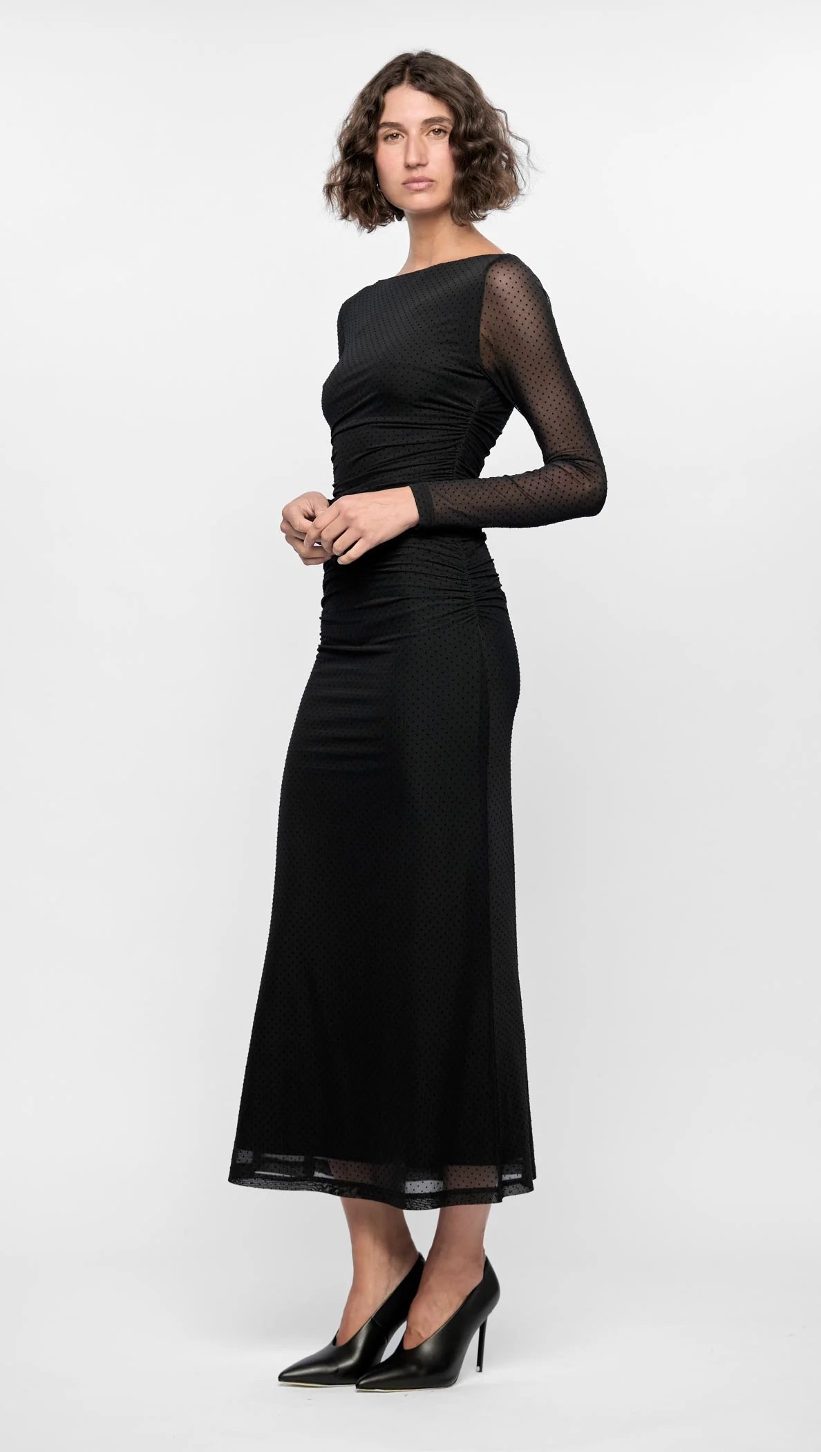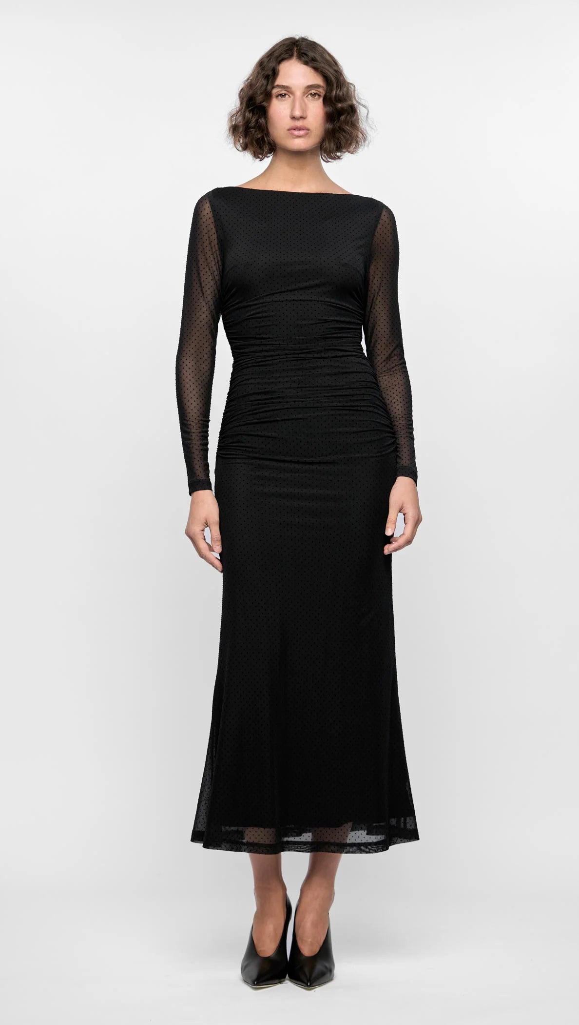 The Kaia Mesh Maxi Dress is your go-to for sleek sophistication. With subtle spot texture, ruched waist and sheer sleeves, it’s the perfect after-dark silhouette.