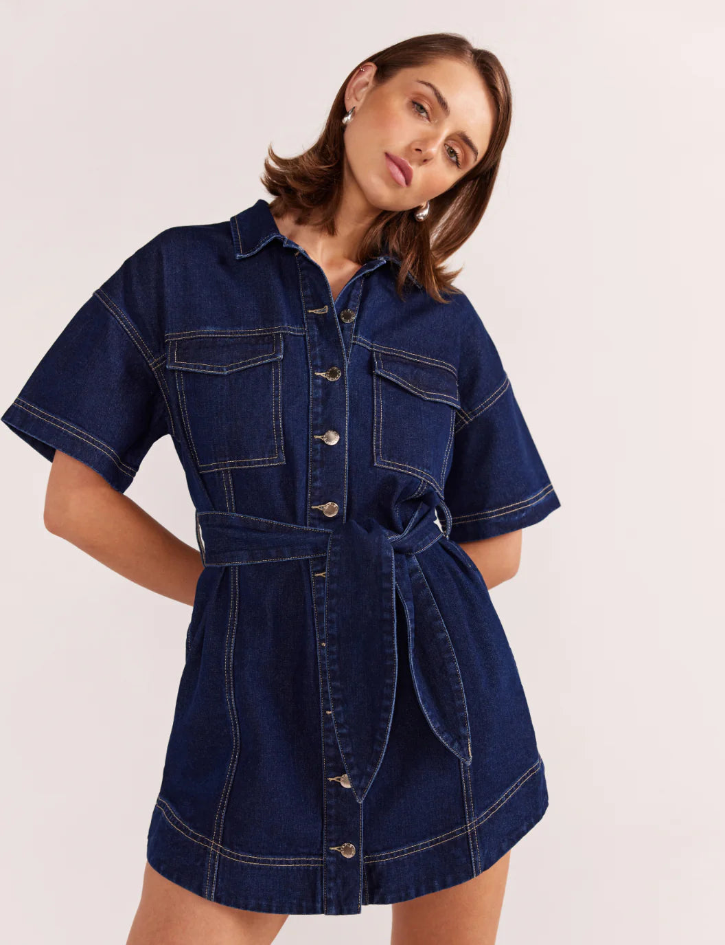 The Luca Denim Mini Dress By Staple The Label is the new and improved denim dress your wardrobe has been waiting for. Denim dresses are a classic Summer essential everyone needs to get you through the season. Made from a mid weight denim this style has contrasting top stitching and chest patch pockets and has a scooped style hem line that gives a flattering shape. With short sleeves and adjustable waist tie belt it’s your go-to piece for any casual occasion. Style with strappy sandals or white sneakers, add some jewellery and away you go.