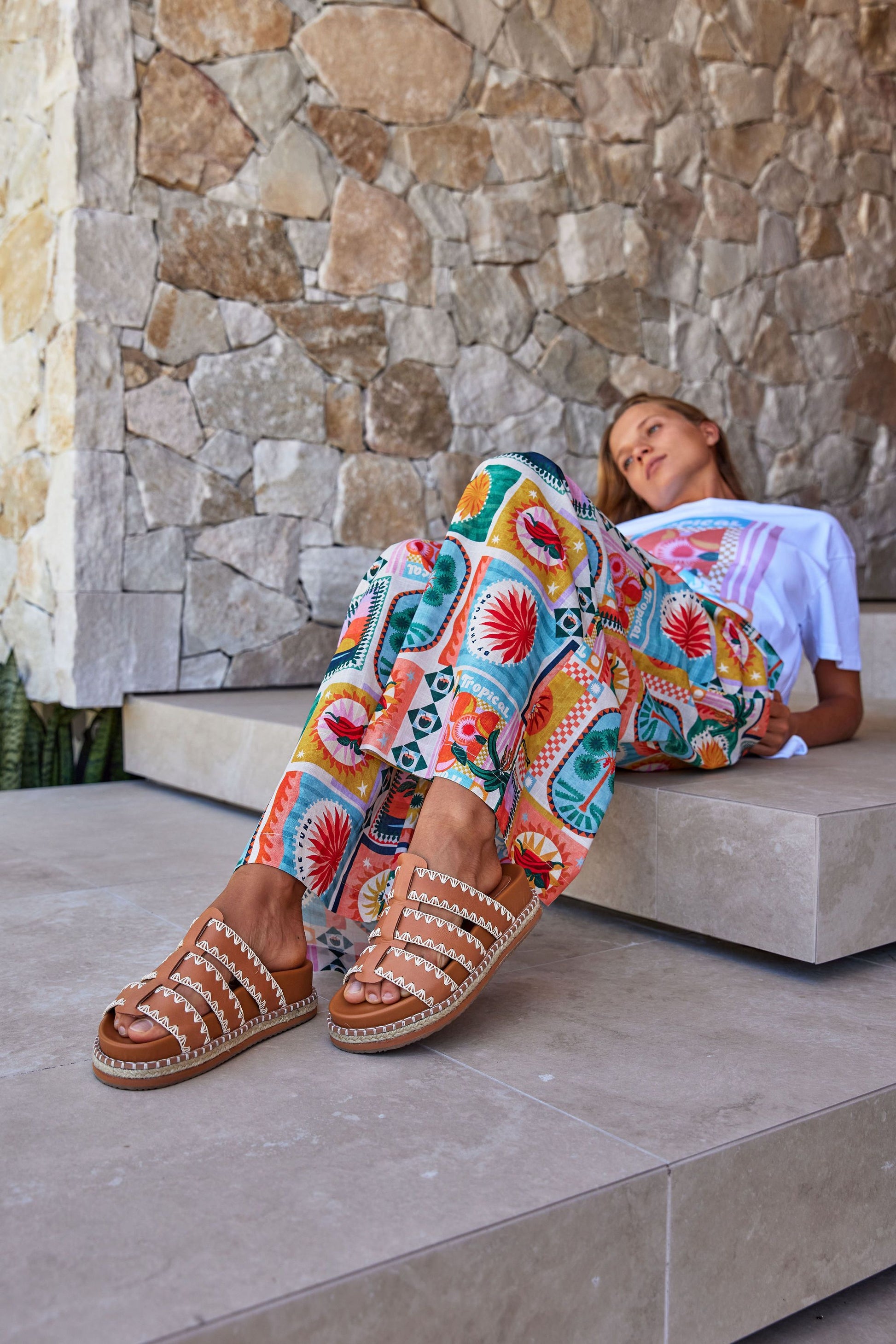 Elevate your off-duty look with the Iva Slide, a modern take on relaxed summer style. Crafted from genuine leather, this open-toe design features bold, multi-strap detailing with contrast embroidered stitching for a playful yet refined finish. A cushioned footbed and espadrille-inspired midsole deliver all-day comfort with a crafted feel. Available in classic Black or warm Coconut Tan, it’s the perfect partner for breezy dresses or casual denim.