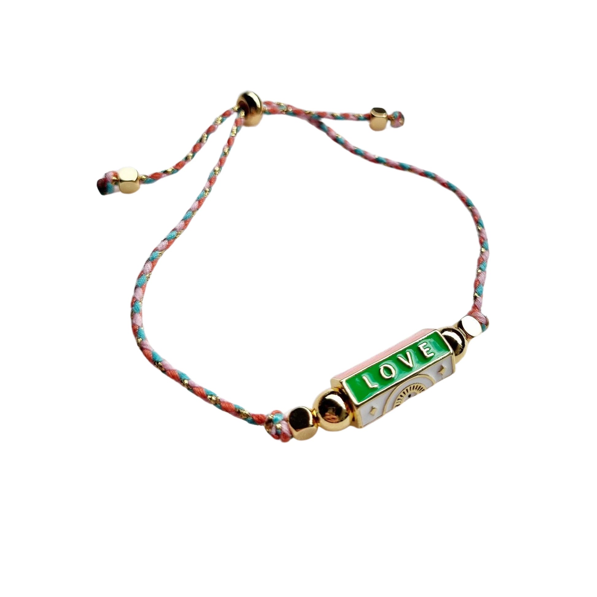 The Cord Bracelet in Love features a plated cord in pink, red, blue and gold